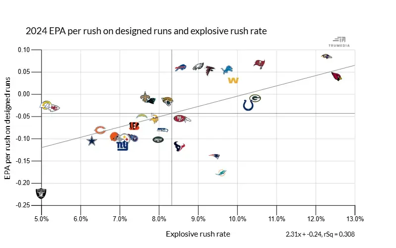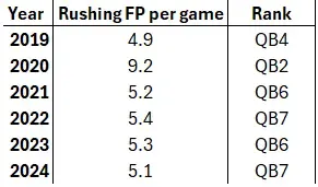 Ultimately, the return of OC Drew Petzing makes it fairly unlikely that we see a steep increase in designed runs. Murray did scramble a bit more in 2024 (6.7%) than in 2023 (5.3%), but it seems like wishful thinking to believe he'll get back to his ridiculous 2020 heights (not a short joke I swear).