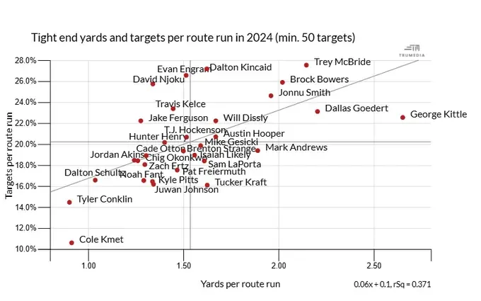 The stud TE broke out in a major way in 2024, catching 111 of his ridiculous 147 targets for 1,146 yards … and 2 TDs.