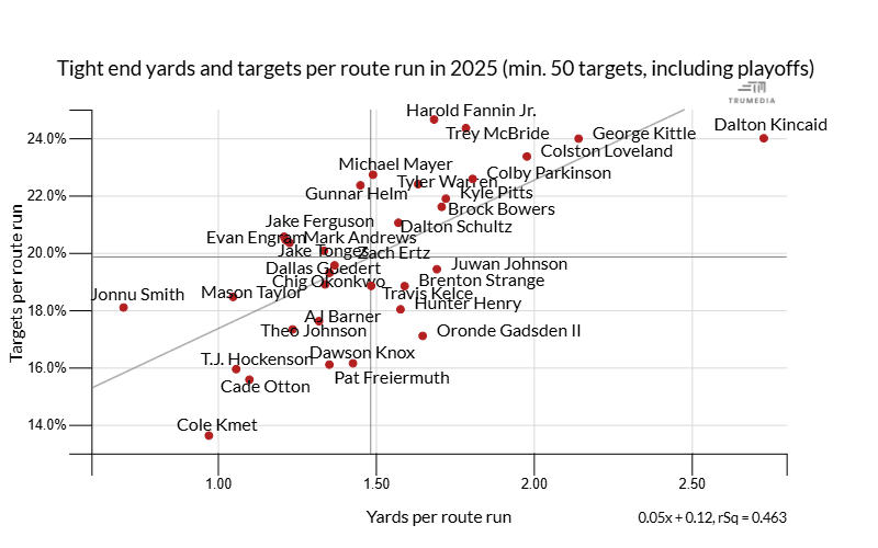 While it's risky business to assume high-end efficiency will keep on keeping on with a major uptick in volume, Kincaid would profile as the Bills' top-target earner with the benefit of a full-time role—something that would instantly make him a potential top-5 option at the position in 2026 drafts.