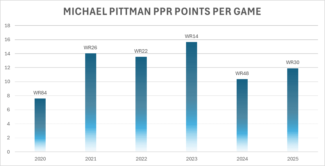 Note that Pittman was actually averaging an even more solid 13.9 PPR points per game through Week 14 last season before old man Philip Rivers took over.